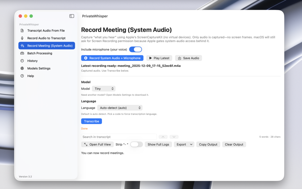 Most transcription tools upload your recordings to the cloud. This one doesn’t. Everything happens on your device, using your Mac’s CPU/GPU. No accounts, no API keys, no recurring fees.